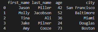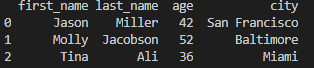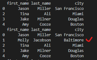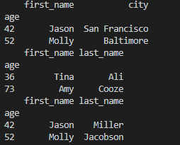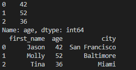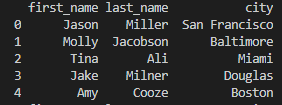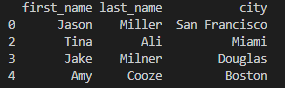 print(df[['first_name', 'city']][:2]) # column name, index number