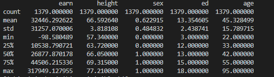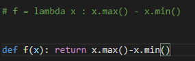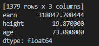 f()는 어떤 데이터에서의 최댓값과 최솟값의 차이를 반환합니다. 이러한 f()가 'earn', 'height', 'age' 각 column에 적용된 결과를 볼 수 있습니다.