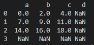 df1에는 4번째 row가 없고, index 'd'도 없으므로 NaN이 채워져 있네요.