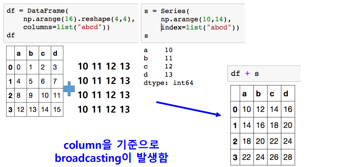 numpy에서 array와 scalar 사이의 연산이 가능했듯이, Series와 DataFrame 간의 연산 역시 가능합니다. 이때는 column 방향으로 broadcasting이 일어납니다.