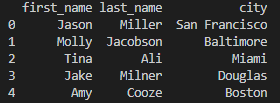 'city': ['San Francisco', 'Baltimore', 'Miami', 'Douglas', 'Boston']}