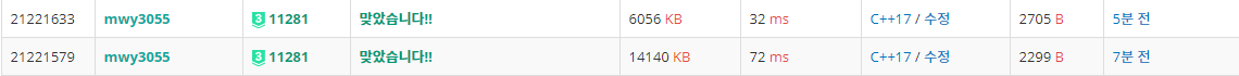 위가 vector<vector<int>>, 아래가 vector<set<int>>를 사용한 코드이다. 분명 자료구조만 바꿨는데도 시간 차이가 크게 난다. 이쯤되면 중복 제거할 때도 set을 사용하지 않을 것 같다. vector에서도 $NlogN$ 시간에 중복을 제거할 수 있기 때문이다.