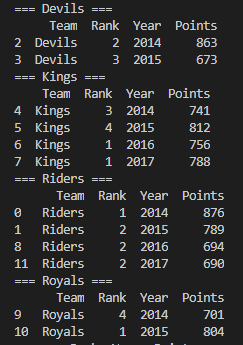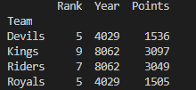 ipl_data = {'Team': ['Riders', 'Riders', 'Devils', 'Devils', 'Kings',
