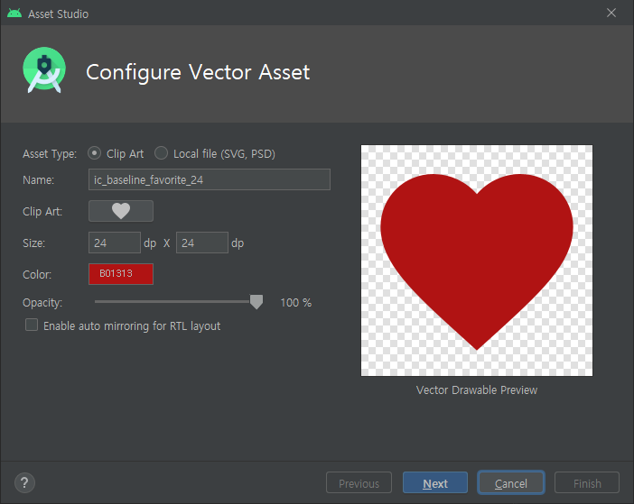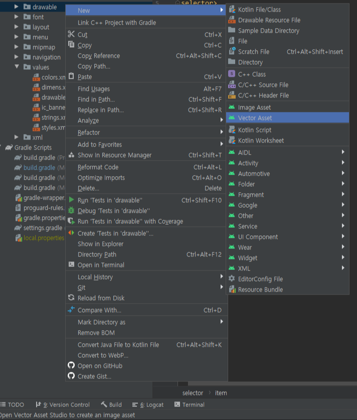 res/drawable 폴더에 오른쪽 버튼을 누르고 New→Vector Asset을 클릭한다.