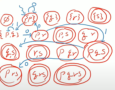 위의 ``NFA``를 ``DFA``로 바꿔 보자. ``DFA``는 한 번에 하나의 상태밖에 가질 수 없기 때문에 ``NFA``의 상태가 $n$개일 때 $2^{N}$개의 상태를 가져야 한다. 또한 ``DFA``의 각 상태에서 알파벳을 읽었을 때 갈 수 있는 모든 상태로 가는 전이함수를 생각해야 한다. 예를 들어, 위의 ``NFA``에서 $p$에 있을 때 $1$을 읽으면 $p$ 또는 $q$에 있을 수 있으므로 $(\{p\}, 1) \rightarrow \{p, q\}$이다.