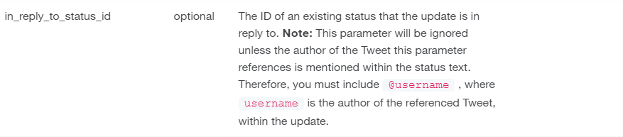 그런데 자기 트윗에만 답글이 보내지고, 다른 유저의 트윗에는 답글을 보낼 수 없는 문제가 발생하였다. 이 문제에 대한 힌트는 트위터 API 문서에서 찾을 수 있다.