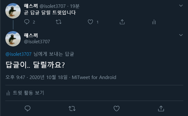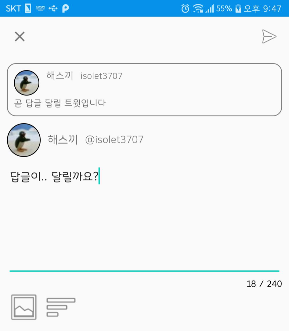 트윗에 답장을 보낼 수 있는 기능을 추가하였다. 답장 버튼을 눌러 답장을 보낼 수 있다. 사실 위의 사진이 답장을 다는 모습을 캡쳐한 것이다.